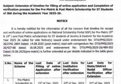 Jammu, Dec 01, 2025: The Directorate of Tribal Affairs, Government of Jammu and Kashmir, has announced an important revision to the application schedule for the Pre-Matric and Post-Matric Scholarships for Scheduled Tribe (ST) students for the 2025–26 academic session. According to the latest notification, the last date for submitting online applications and completing verification on the National Scholarship Portal (NSP) has been extended to ensure that more students are able to finish the required formalities without difficulty.
